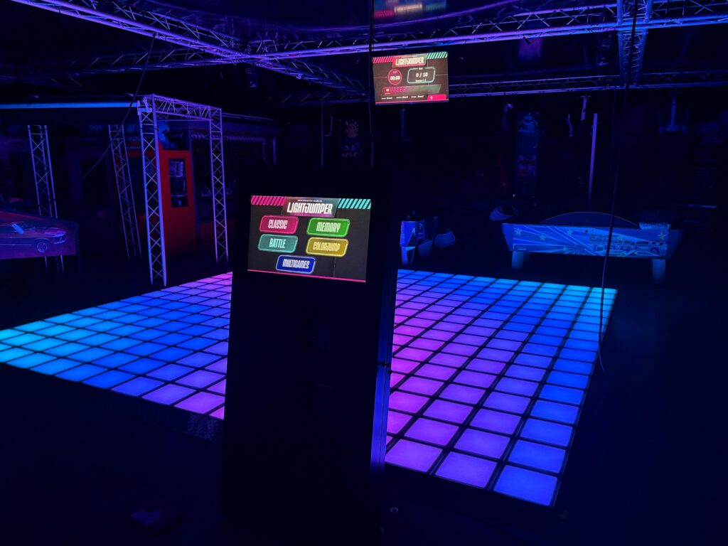 Auf dem interaktiven Gaming-Boden von Lightjumper treten Spieler:innen auf hunderte leuchtende Pixel-Felder, die blitzschnell reagieren. Das Ziel? Geschicklichkeit und Reaktionsschnelle unter Beweis stellen – denn hier wird jede Bewegung zum Teil der Spielmechanik. Die Pixel-Felder leuchten individuell in verschiedenen Farben auf und werden per Berührung mit dem Fuß aktiviert. Nun gilt es, in einer Vielzahl verschiedener Spiele und Spielmodi wie z.B. „Boden ist Lava“ den rot leuchtenden Feldern auszuweichen und die blauen einzufangen.